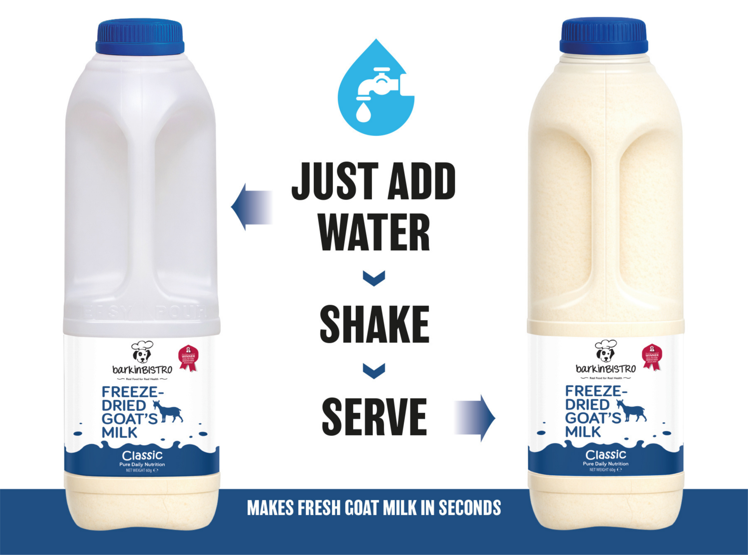 Just add water when needed and enjoy fresh goat’s milk in seconds.