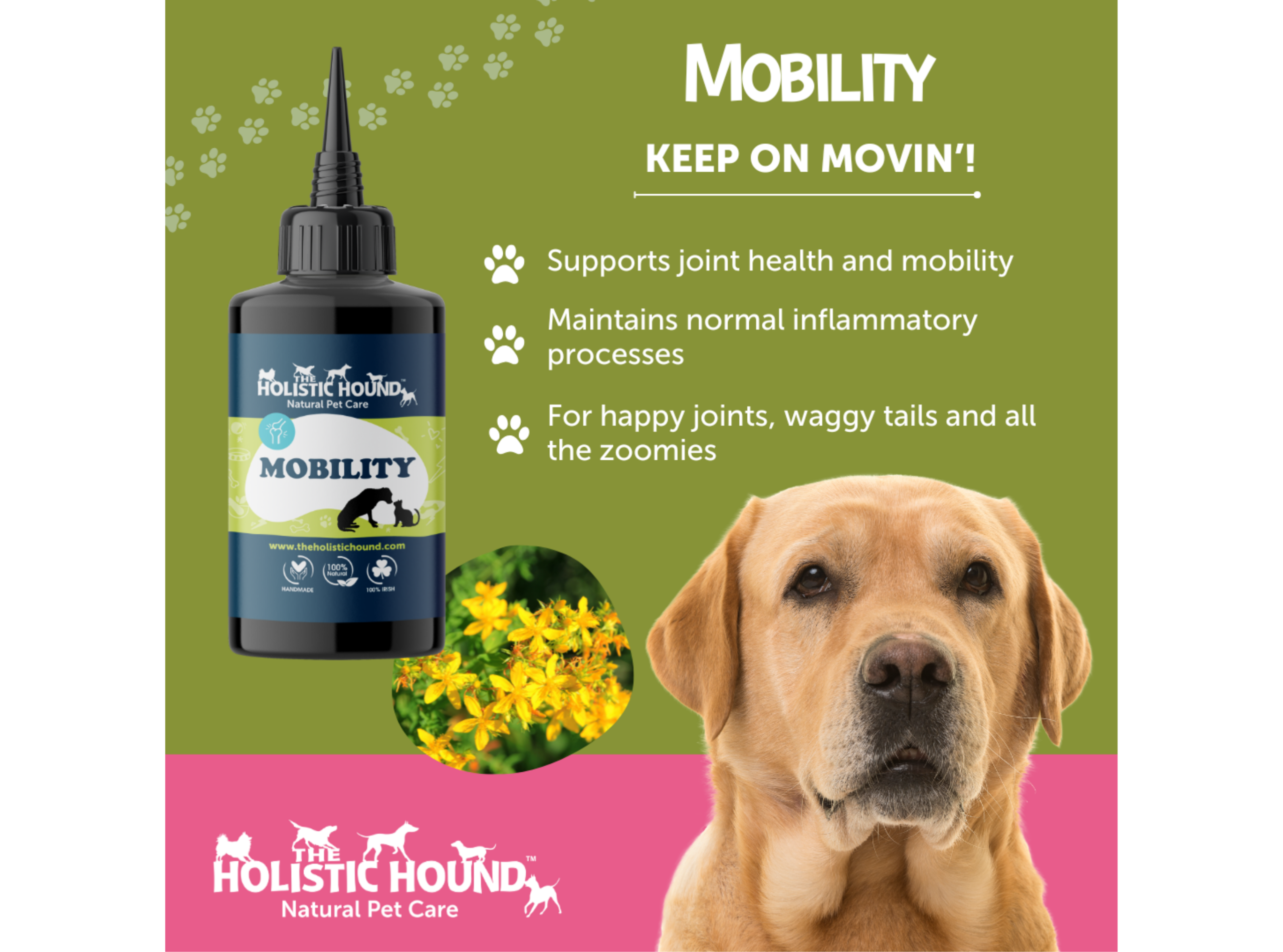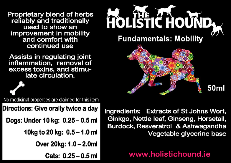 Suited to pets with mobility restrictions, from either age degeneration (arthritis, cdrm) or physical disability (e.g. hip dysplasia, IVDD). The blend is anti-inflammatory, improves circulation and detoxification processes, and addresses the stress and emotional impacts caused by chronic, painful illness.