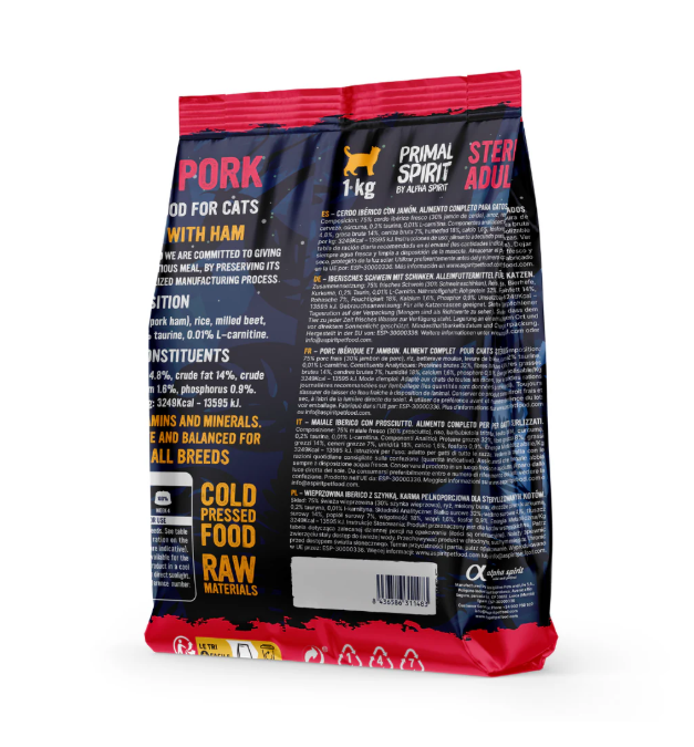 Our Primal Spirit Iberian Salmon Complete Dry Cat Food for Sterilised Cats has been made from 75% fresh ingredients and has been prepared in high-quality conditions resulting in the best possible final product for your pet. It is gluten-free, meat meal free and contains no artificial colours or flavours making it a fantastic choice for your beloved cat. This product is ideal for neutered cats due to its lighter composition.