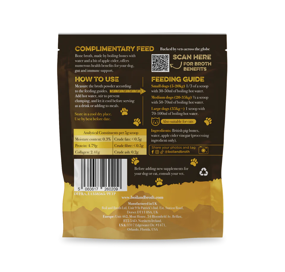 A 50g pouch can rehydrate back to 1 litre of liquid bone broth. This is equivalent to 30 servings for a small dog.