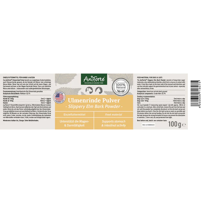 Our Slippery Elm Bark Powder consists of 100% American red elm bark, which is gently dried and ground. This way you get a pure natural product, perfectly adapted to the needs of your animal due to our high quality standards. It has a high level of acceptance in terms of taste.